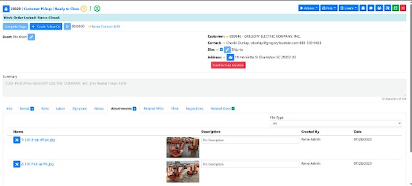 The inspection form gets completed at checkout. The driver takes delivery pictures along with confirming fuel levels and hours on the unit (if applicable) and collects a digital signature of the receiving party on site. Any existing damage gets noted and documented. If the customer wants, you can email the completed inspection form along with delivery pictures right then and there. That way, the customer has all the information in real time at the time of delivery. All photos and attachments become part of the contract and are easy to find later if you ever need to refer back to them.